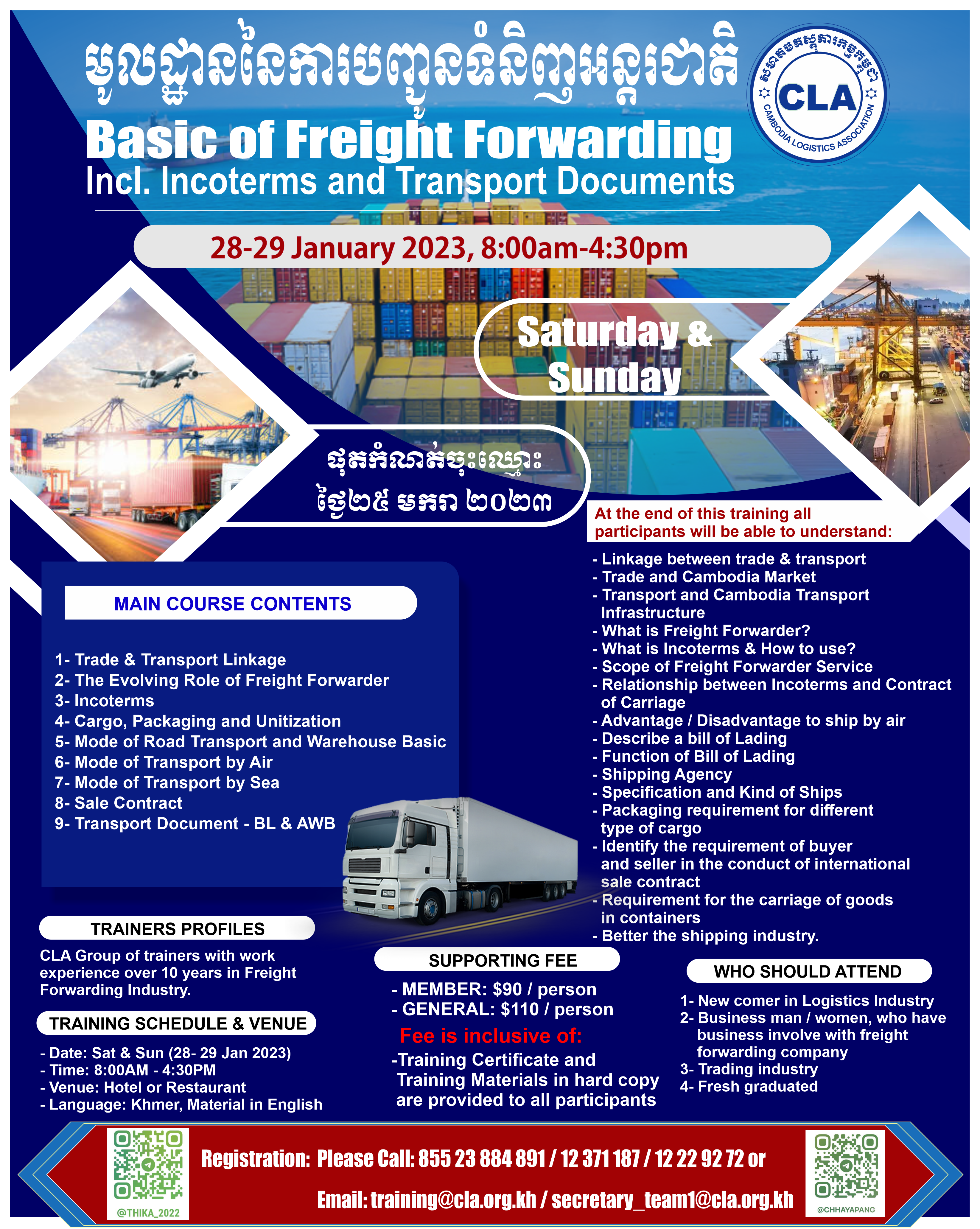 Dear Valued Member and Clients, Welcome to the new year 2023! The 1st training for the new year for logistics and transportation skills is about (មូលដ្ឋាននៃការបញ្ជូនទំនិញអន្តរជាតិ) “Basic of Freight Forwarding Incl. Incoterms® & Transport Documents” will be take place in Phnom Penh on 28th & 29th January 2023. Please find more detail of the training below and attached files accordingly.